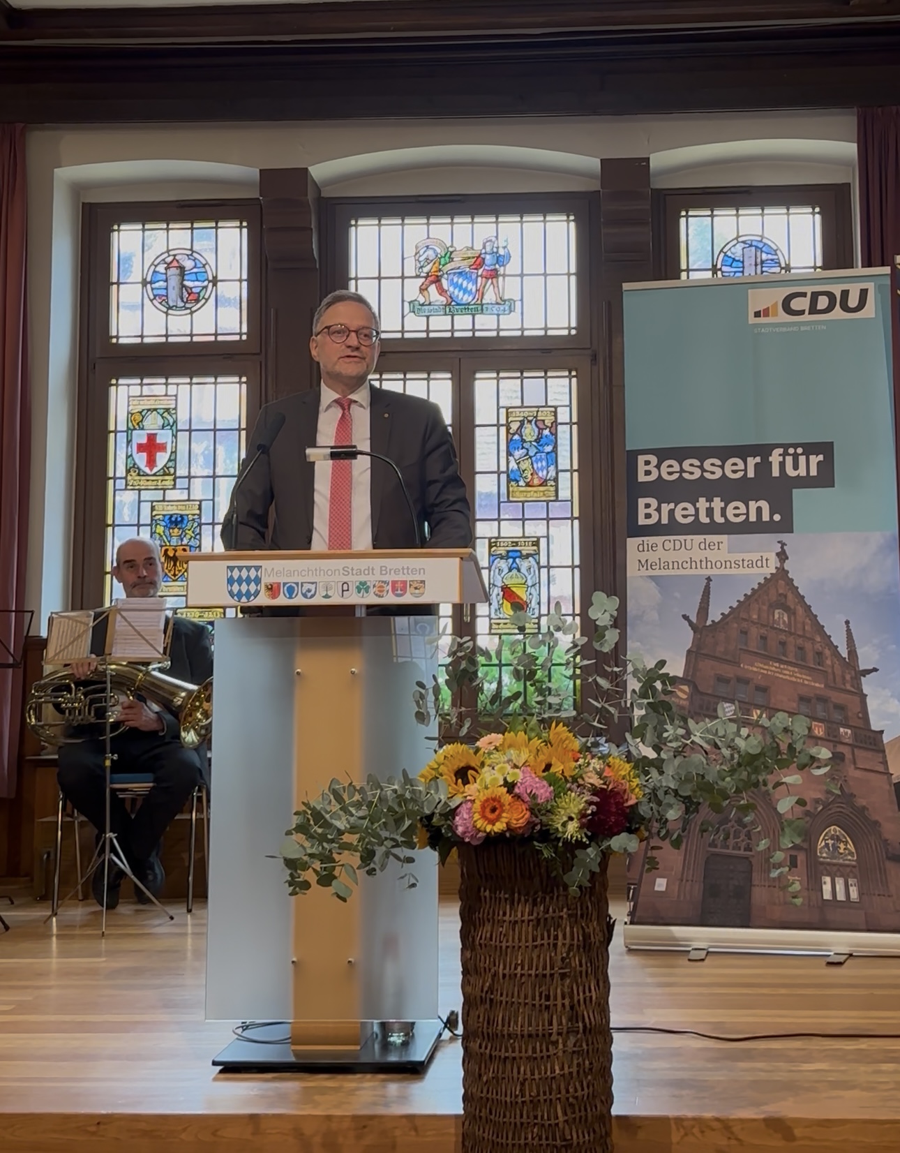 Die gut besuchte Feierstunde der CDU Bretten im Bürgersaal des Alten Rathauses wurde musikalisch umrahmt von einer Bläsergruppe der Stadtkapelle Bretten, die am Ende des Programms zum Mitsingen der Deutschlandhymne und des Badnerliedes einlud.